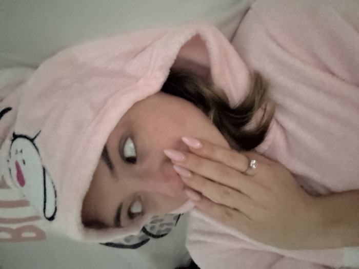 A woman, wearing a pink bunny-eared hooded bathrobe, poses with her hand near her face. She has manicured nails and wears a diamond ring on her ring finger. Her hair is styled and partially visible outside the hood. The bathrobe features a cartoon bunny design in white and black. She gazes directly at the camera, creating an intimate and somewhat playful atmosphere.