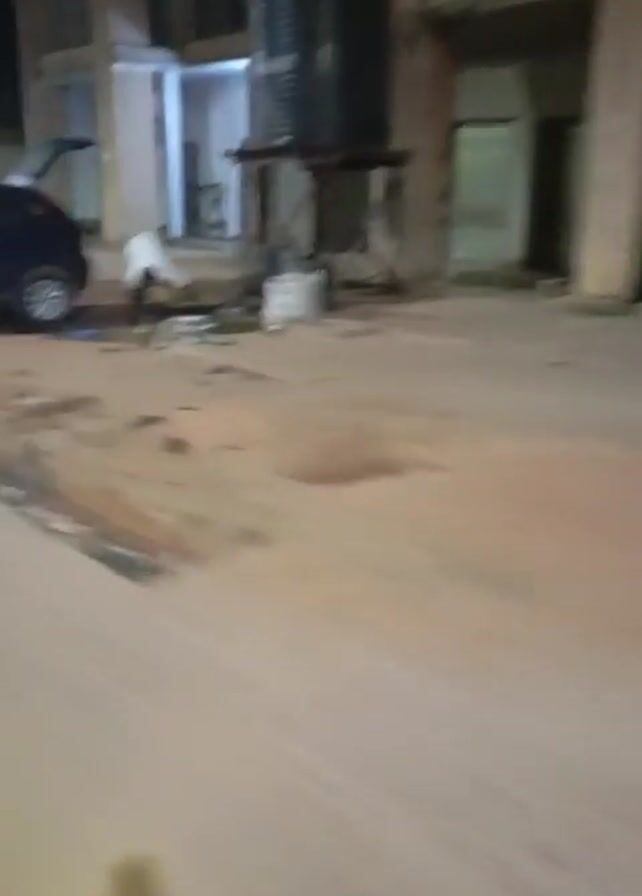 poorly lit outdoor area at night, possibly a parking lot or loading zone. There is a building in the background with some visible features like windows and an open garage door or entrance. In the foreground, there is a dark blue hatchback car parked with its trunk open. Beside the car, there is a white bundle or package on the ground. The ground appears to be muddy or damp. The camera moves quickly, suggesting it is being held by someone walking or moving fast.