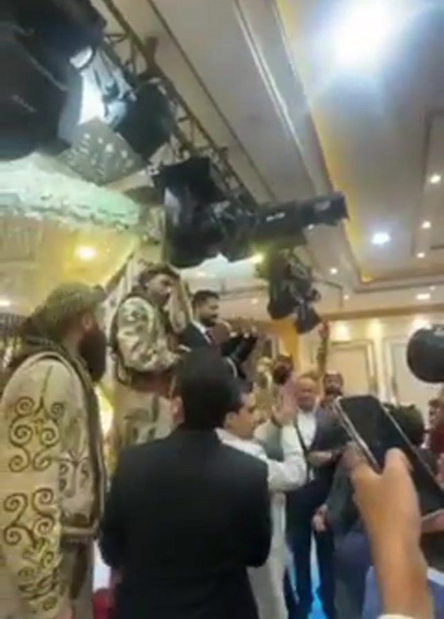 Inside a large, brightly lit hall, a group of men are gathered on a stage. The focal point is a man in a dark suit and red tie, who is smiling and gesturing with his hands in the air. He appears to be the center of attention, possibly celebrating or giving a speech. Several other men, some in traditional clothing with head wraps, are standing around him, cheering and clapping. A man to his left is wearing military-style camouflage. A group of camera operators, holding cameras and cell phones, are taking pictures and recording the scene. The stage is decorated with floral arrangements and is surrounded by large lighting rigs. The overall atmosphere suggests a wedding or celebratory event.