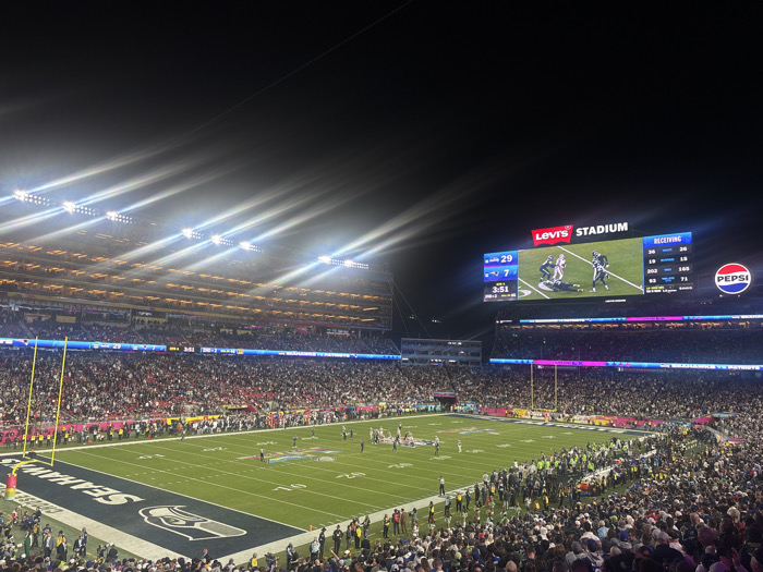 Levi's Stadium hosts a football game. Stadium lights shine brightly on the field, crowded with players and linesmen. Fans fill the stands on both sides. A large screen displays the game score (29-7) and a live football play. The Seattle Seahawks logo is painted in one end zone. A Pepsi advertisement is also visible.