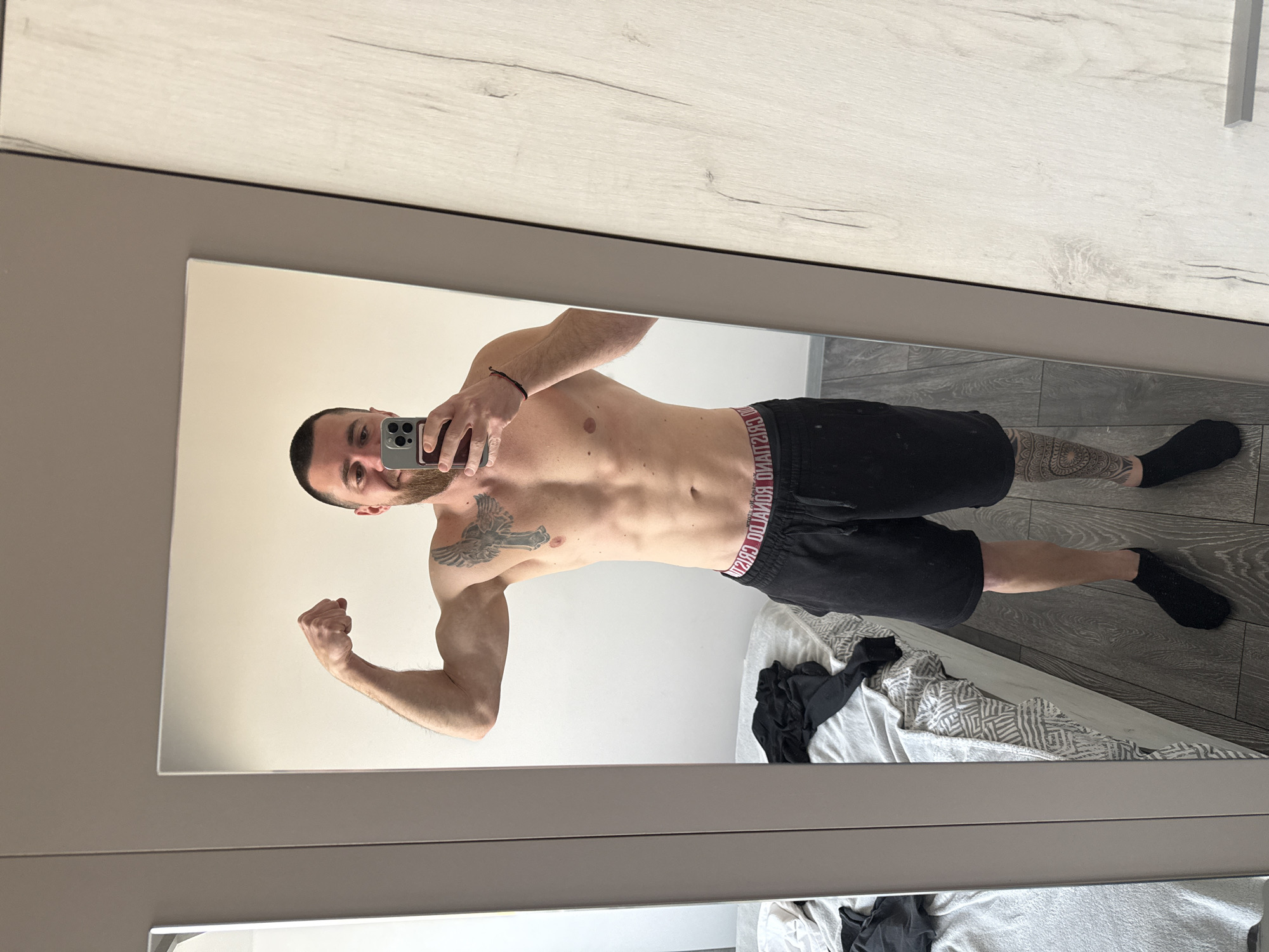 shirtless man with a beard, taking a selfie in a mirror. He is wearing black shorts and black socks. He has tattoos on his left arm and leg. The background includes a bed with bedding and a wardrobe. It is not possible to determine the location in Sofia, Bulgaria from this image.