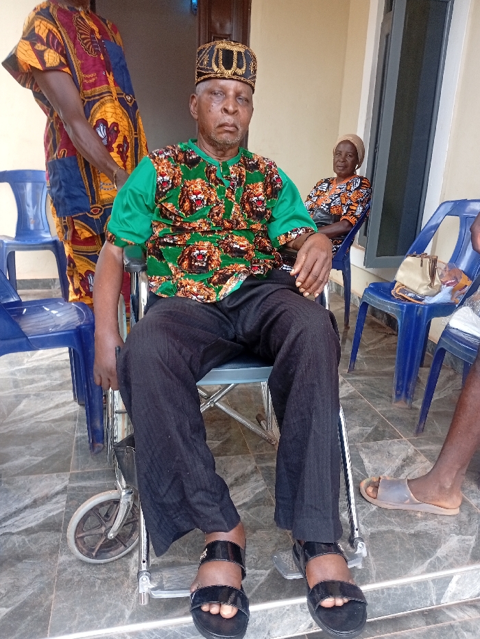 The scene depicts an outdoor or semi-outdoor area, likely a veranda or porch of a residence, located in Nsukka, Nigeria. Three identifiable individuals and parts of a fourth are present. In the foreground, an elderly Black male with a neutral expression is seated in a silver manual wheelchair. He wears a black and gold embroidered cap, a green short-sleeved shirt patterned with lion faces, black trousers, and black open-toed sandals. His feet rest on the wheelchair footrests. Behind and to the left of the man in the wheelchair, a Black male stands partially visible, dressed in a colorful patterned traditional Nigerian attire, predominantly orange, red, yellow, and blue. Behind and to the right of the central figure, an elderly Black female is seated on a blue plastic chair. She wears a light brown headscarf and a patterned shirt in orange, black, and white. A light brown handbag rests on another blue plastic chair next to her. In the bottom right corner, the legs and feet of a fourth Black individual are visible, wearing light-colored trousers and translucent open-toed sandals, suggesting they are also seated on an unseen chair. The floor is tiled with a dark gray, subtly patterned surface. The background consists of a plain light beige or cream-colored wall, with a dark-framed window or door visible on the right and a dark wooden door partially visible on the left. Several blue plastic monobloc chairs are scattered in the scene.