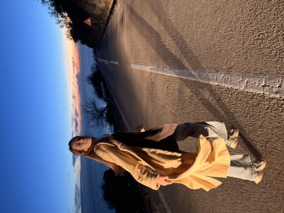 A woman in a beige coat and light blue jeans poses on a paved road. A faded white line divides the road, which curves into the distance. The sky transitions from deep blue to lighter shades, revealing a glimpse of clouds and a possible body of water along the horizon. A road sign is visible on the left side, and sparse trees line the edge of the road.