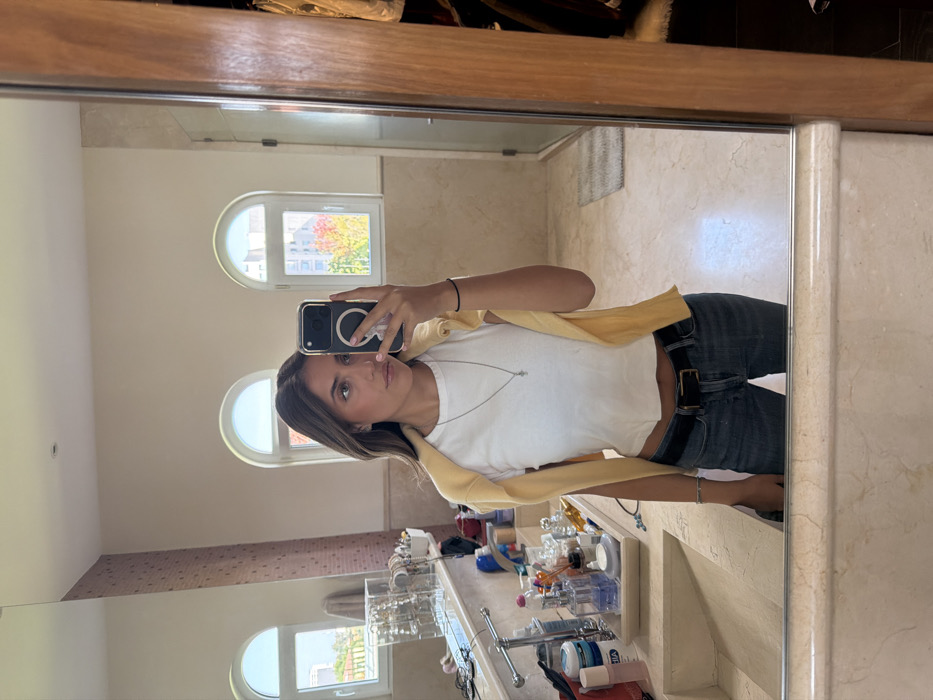 A female subject is captured in a mirror selfie within a bathroom setting. She wears a white sleeveless crop top, blue jeans with a black belt, and a light yellow sweater draped across her shoulders. A silver chain with a small cross pendant hangs around her neck, and a black elastic band is on her left wrist. She holds a dark-colored smartphone, equipped with a circular magnetic accessory, in her right hand, obscuring part of her face. The bathroom features light beige stone-tiled walls and a matching countertop and sink. The counter holds various toiletries, including bottles, a clear acrylic organizer, and a chrome faucet. Two arched windows in the background display an urban environment with buildings and trees exhibiting green, yellow, and red foliage. A glass shower enclosure and a gray bath mat are visible on the right side of the frame. This scene is located in Mexico City, Mexico.