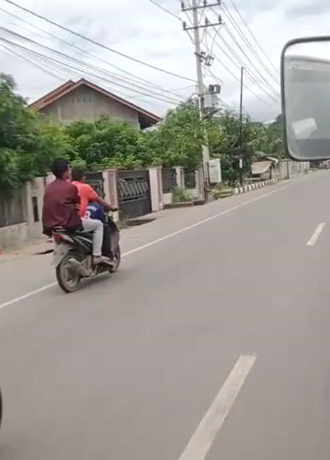 gray asphalt road with a white double line down the center, viewed from a moving vehicle. On the left side of the road are houses, greenery, utility poles, and a black and white curb. The right side of the frame shows the side mirror and window of the vehicle from which the recording is being made. A motorcycle with two people is traveling in the same direction as the camera car. The motorcycle passes the camera vehicle, showing the driver in a white shirt and hat and the passenger in a green floral dress and hijab. The sky is overcast.
