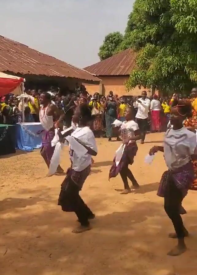 The video depicts a group of young people performing a dance in an outdoor setting. They are all wearing white t-shirts and what appears to be matching traditional patterned cloths around their waists. The dancers are performing on a dirt ground surface. Some are also carrying white cloths. The dancers are performing facing away from the camera, and towards an audience gathered behind a decorated table. Several buildings with corrugated metal roofs can be seen in the background, as well as a large tree providing shade. The sky is partly cloudy. The audience consists of men, women and children, many wearing casual clothing, some taking photos or videos.
