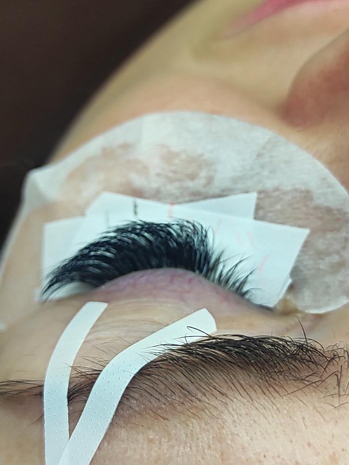 The scene is situated in Sevastopol, Ukraine. The image provides a close-up, high-angle view of the right side of a person's face during an eyelash extension procedure. The individual's eye is closed. The upper eyelid features a dense application of dark, voluminous artificial eyelashes, fanned out and extending significantly past the natural lash line. A crescent-shaped white under-eye pad is positioned on the lower eyelid and upper cheek, protecting the lower lashes and skin. Several small, rectangular white adhesive strips are visible on the upper eyelid, partially covered by the artificial lashes. Two longer, narrow white adhesive strips are placed vertically across the natural, dark eyebrow. The skin around the eye and eyebrow appears fair, with a slight reddish hue visible on the upper eyelid. A blurred portion of the person's upper lip or philtrum is faintly visible in the top right background. The immediate environment is out of focus, suggesting an indoor setting, likely a beauty salon, with soft, ambient lighting.