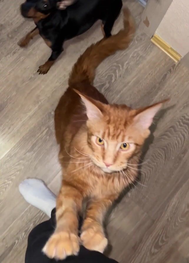 A person wearing black pants and a white sock is petting an orange Maine Coon cat in an indoor setting