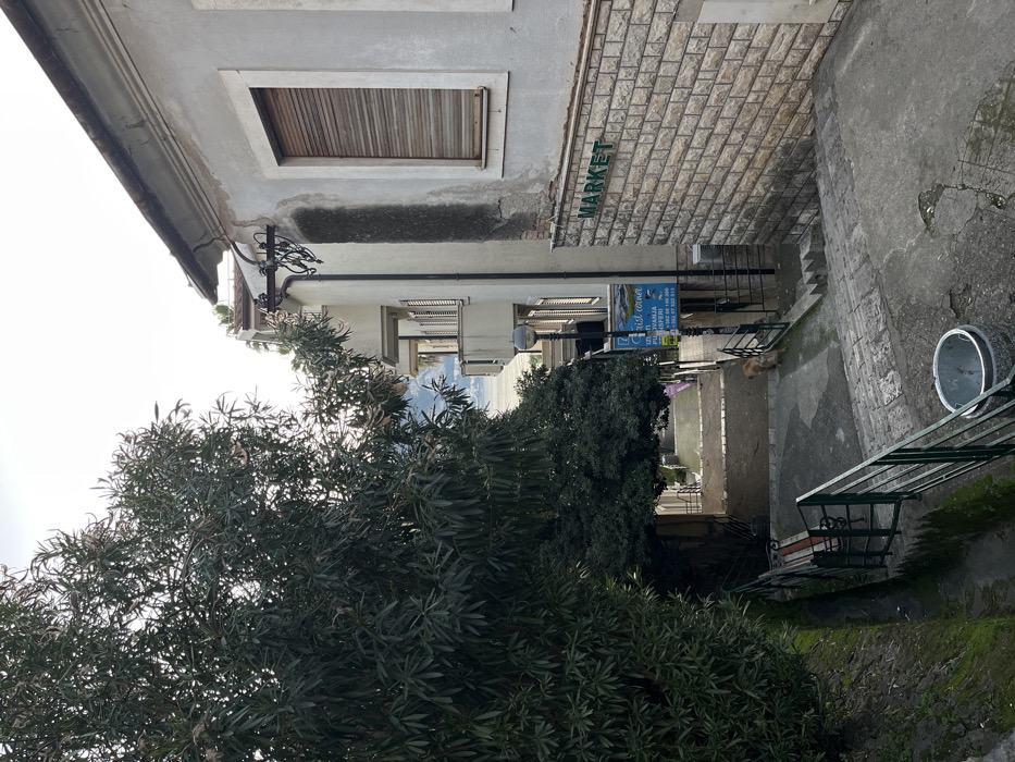 A street scene shows a building labeled "MARKET" with a barred window above. Below the market sign is a blue advertisement board. A set of stone steps leads down, with black iron railings. A dog rests near the top of the stairs. A silver bucket sits near a green metal bench and railing on the right. A large green tree occupies the left foreground. The background shows a glimpse of water and mountains.