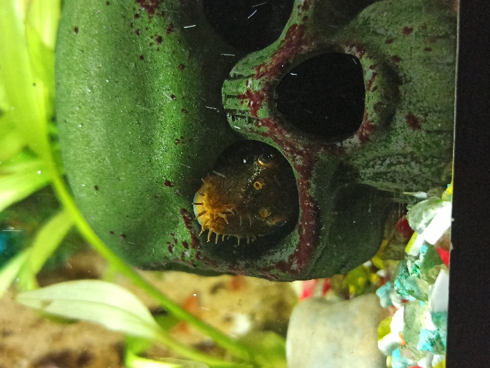A golden bristle-nose pleco is nestled inside the eye socket of a green skull decoration within a fish tank