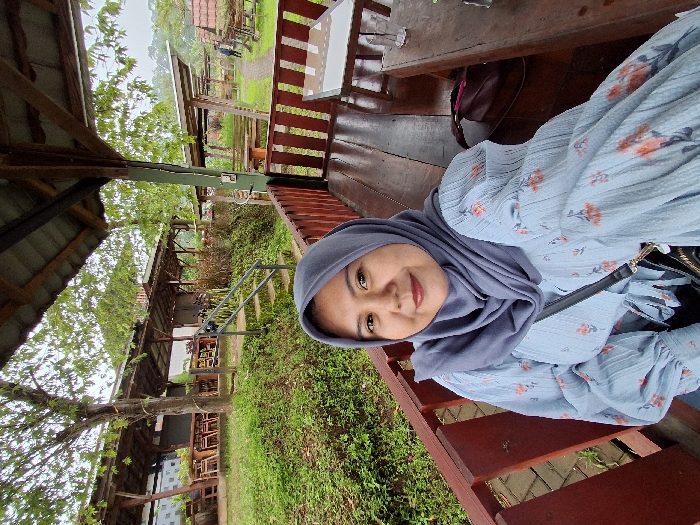 A woman wearing a light blue floral patterned dress and a gray hijab smiles at the camera. She's seated on a bench inside a wooden structure with open sides. Outside, lush greenery, various wooden buildings, and structures are visible in a slightly overcast or misty setting. The overall scene suggests a relaxed outdoor or rural environment.
