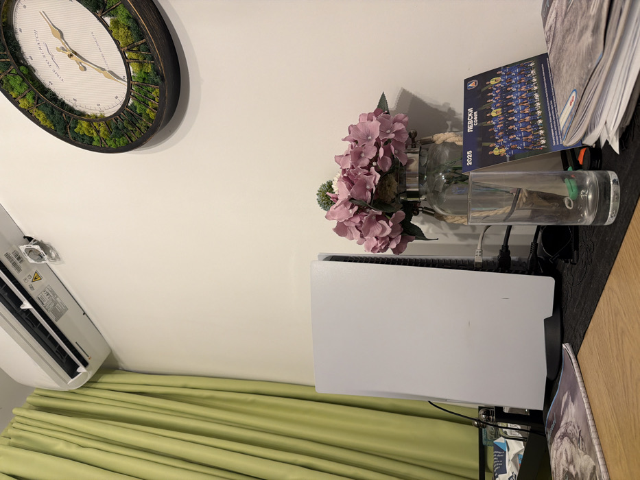 The scene depicts an interior room in Varna, Bulgaria. A plain white wall forms the background, complemented by light green curtains on the left. A white split-unit air conditioner is mounted high on the left wall. An oval-shaped wall clock with a preserved moss or forest-like design and "TIME TO SCRATCH" text is affixed to the upper right wall. A white PlayStation 5 console stands vertically on a black base in the mid-ground, with multiple black cables visible behind it. To the right of the console, a clear glass vase, accented with rope, holds a bouquet of artificial pink hydrangea-like flowers and green foliage. On a black desk mat, a clear drinking glass containing a small green object rests in front of a small 2025 calendar or flyer for "ЛЕВСКИ СОФИЯ" (Levski Sofia), displaying a team photograph. A stack of papers or magazines is partially visible to the right of the calendar. In the lower left foreground, an open magazine featuring a grayscale image of a person's face lies on a light-colored wooden surface. No individuals are present, and no active interactions or actions are depicted.