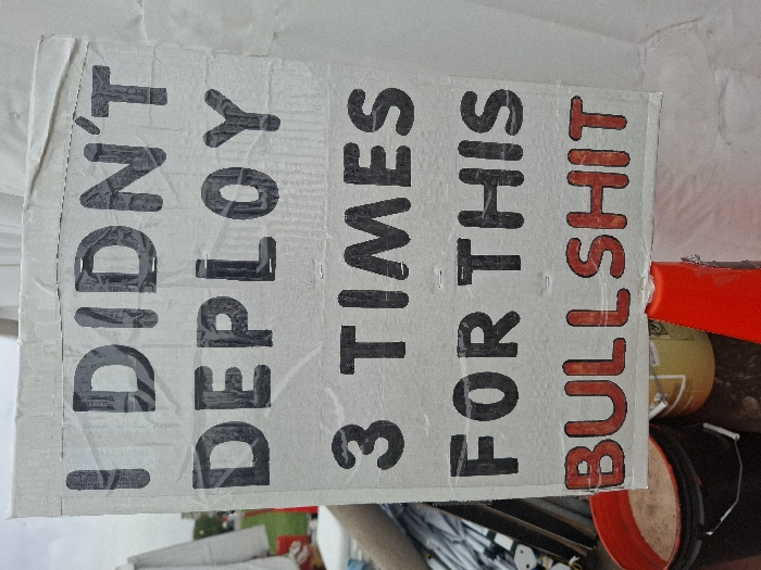 A sign, fashioned from cardboard, displays the text "I DIDN'T DEPLOY 3 TIMES FOR THIS BULLSHIT" in bold, block letters