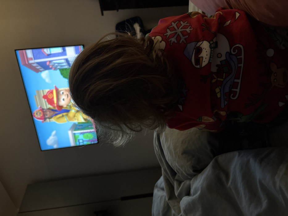 - "A child in red, snowman-patterned pajamas is on a bed with gray linens, intently watching a television mounted on the wall" by FM-lMGvq1, licensed under CC BY 4.0