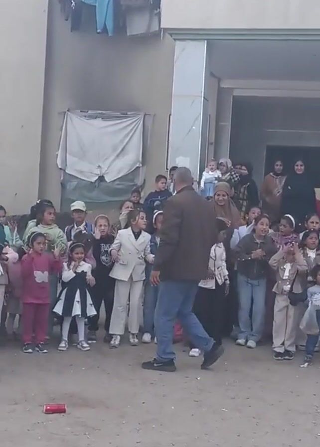The video depicts a group of children and some adults gathered outside a building. The children appear to be of varying ages, mostly elementary school-aged, and are dressed in diverse casual clothing. Some of the adults, who appear to be female, are wearing hijabs. The group is standing on a dirt surface, and behind them is a building with a covered entryway. Some laundry is visible hanging from an upper part of the building. The children are making gestures with their hands and appear to be singing or cheering, with one man walking in front of them. A discarded red can is seen on the ground near the left edge of the frame.