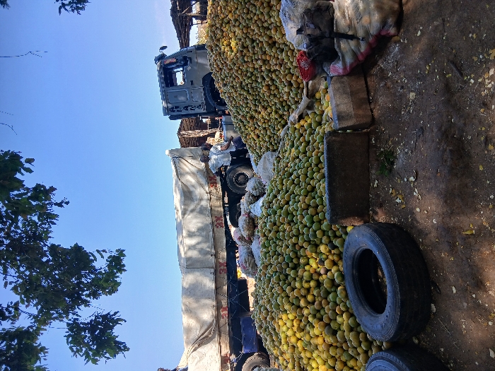 The image depicts an outdoor fruit market or loading area in Vom, Nigeria, under a clear blue sky and bright daylight
