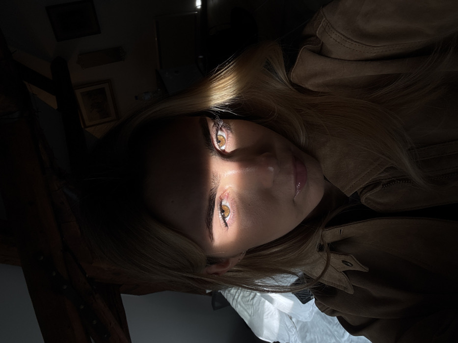 An image taken in an interior residential setting in Villeurbanne, France, features a young woman looking directly at the camera. She has light-colored hair, amber eyes, and is wearing a light brown or tan jacket. A strong, narrow horizontal beam of natural light illuminates her eyes and upper facial features, creating high contrast with the surrounding shadows that envelop the rest of her face and body. The background is dimly lit and includes dark wooden ceiling beams above. To the left, a crumpled white fabric object is partially visible. To the right, framed pictures hang on a dark wall, and a translucent bottle rests on a surface, with faint light sources or reflections further in the background.