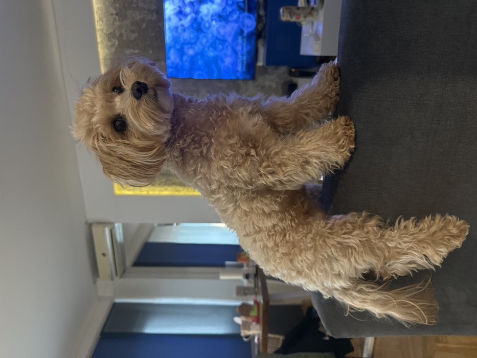 - "A light-brown, curly-haired dog with dark eyes and nose stands on the dark gray upholstered backrest of a sofa or chair" by FM-DXdme2, licensed under CC BY 4.0
