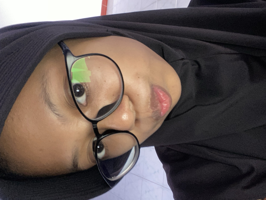 A person wearing a black hijab and glasses looks into the camera with a tilted head