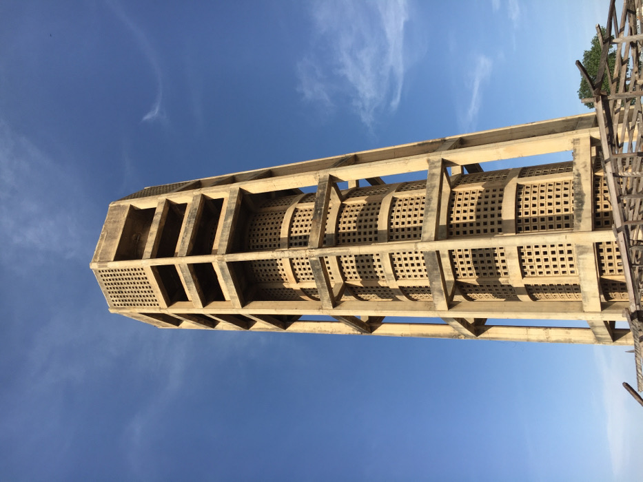The image displays the Jos International Market Tower, located within the Terminus Market area in Jos, Plateau State, Nigeria. The central subject is a tall, octagonal concrete structure, rendered in an aged, weathered light-brown hue against a clear blue sky featuring sparse, wispy cirrus clouds. The tower's design incorporates a prominent external concrete skeletal framework, supporting multiple levels. Its inner core is a cylindrical or slightly tapering form, enveloped by curved sections perforated with numerous small, square openings arranged in a grid pattern. The uppermost visible levels of the tower's outer framework appear open, lacking the perforated panels. In the lower right foreground, a fragmented wooden structure, consistent with scaffolding or building remnants, is partially visible, with a small patch of green tree foliage situated behind it. No individuals, animals, or active scenes are depicted. The scene is illuminated by natural daylight.
