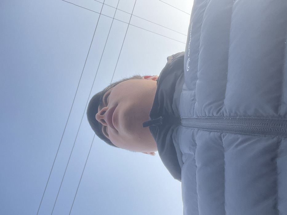 - "A low-angle shot depicts a person wearing a dark, puffy jacket against a light blue sky crisscrossed with power lines" by FM-IswF63, licensed under CC BY 4.0