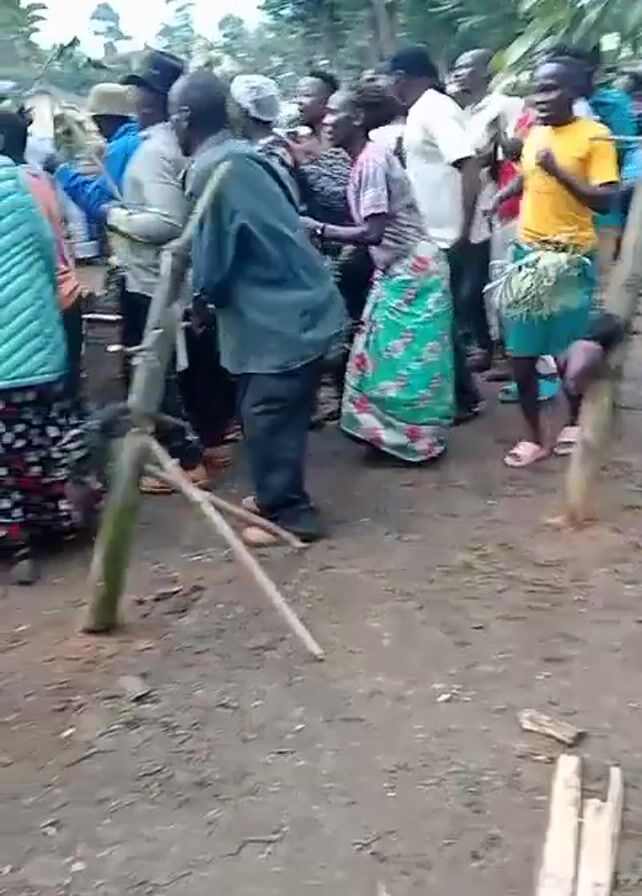 A group of people are gathered outside in what appears to be a rural area. The ground is dirt and patchy grass. Several thin wooden posts are stuck into the ground, seemingly at random. People are standing around in small groups, some are dancing or moving. Some people are wearing brightly colored skirts and dresses. There are trees visible in the background. Some buildings are visible in the background as well.
