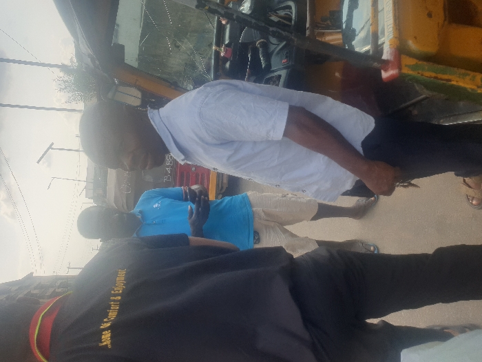 The scene depicts an outdoor daytime setting, identified as Aba, Abia, Nigeria, with three adult males standing on a paved surface