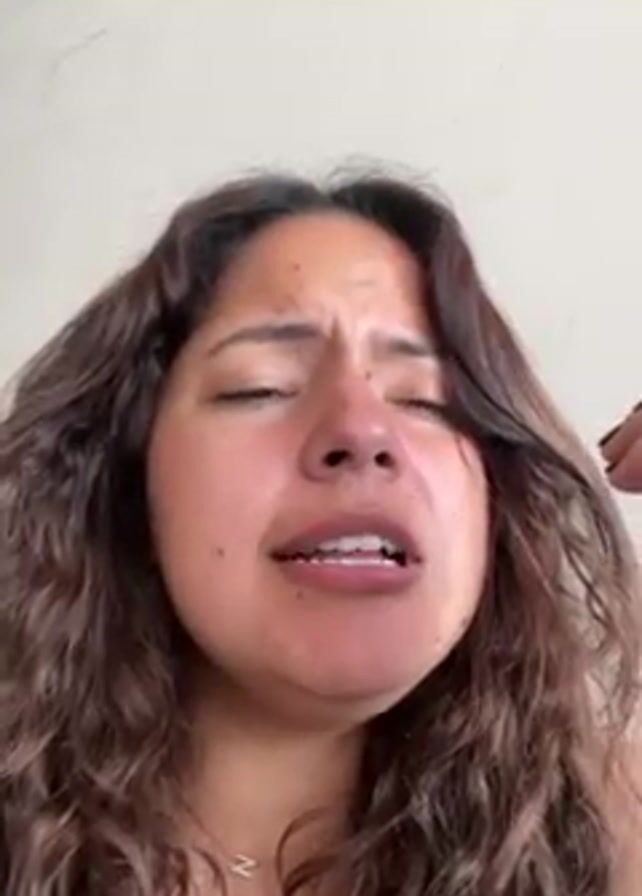 A woman with curly brown hair and light-olive skin, wearing a small necklace with a letter "N," is the sole subject of a close-up video taken from a low angle