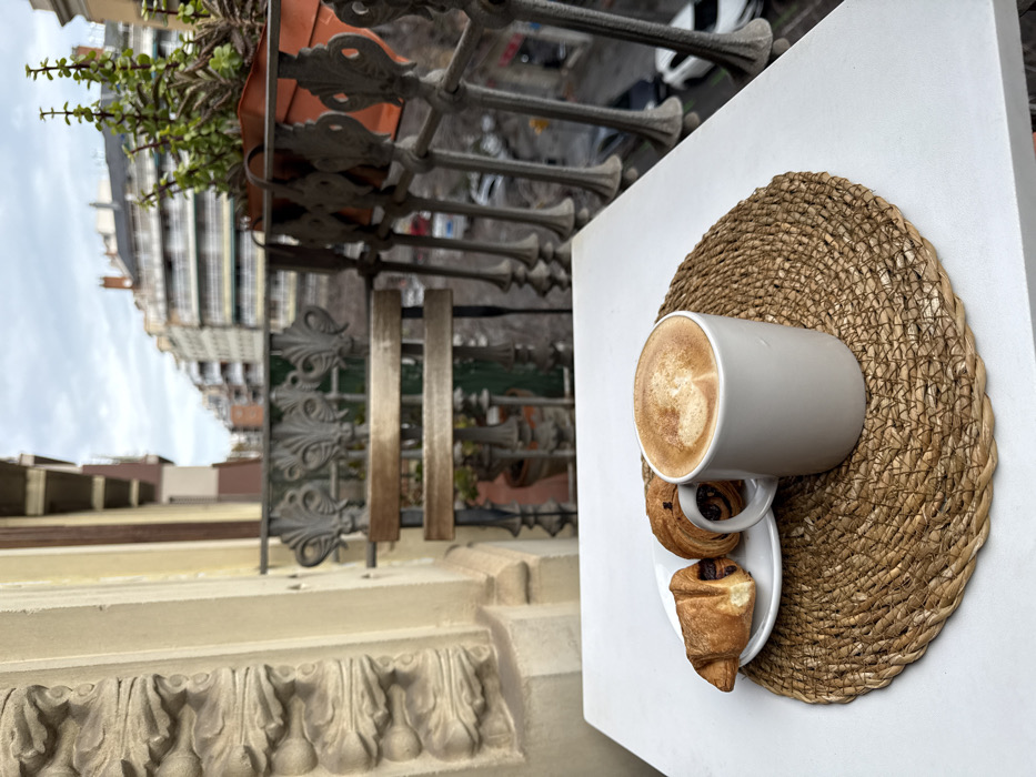 The image depicts a static scene on a balcony overlooking a city street in Barcelona, Spain, likely within the Eixample district, characterized by its grid pattern and multi-story residential buildings. In the foreground, a white square table holds a light gray ceramic mug containing a cappuccino with visible foam, cinnamon dust, and a faint latte art heart shape. The mug rests on a circular placemat woven from a natural fiber. To the left of the mug, on a small white oval plate, are two pastries: one plain croissant and one pain au chocolat. Behind the table, an ornate, dark-colored wrought iron balcony railing features decorative, foliage-like motifs and vertical spindles. A partially visible wooden slatted chair is positioned behind the railing. To the far right, a terracotta-colored planter containing green succulent plants hangs from the railing. The left side of the frame shows a cream-colored building wall with a decorative pilaster or column featuring carved relief work. The background reveals a bustling city street below, with parked vehicles, including several white cars. Further beyond, multiple rows of historic multi-story apartment buildings with balconies and varied architectural details line the street under an overcast sky. No individuals are present or engaged in direct action within the frame.