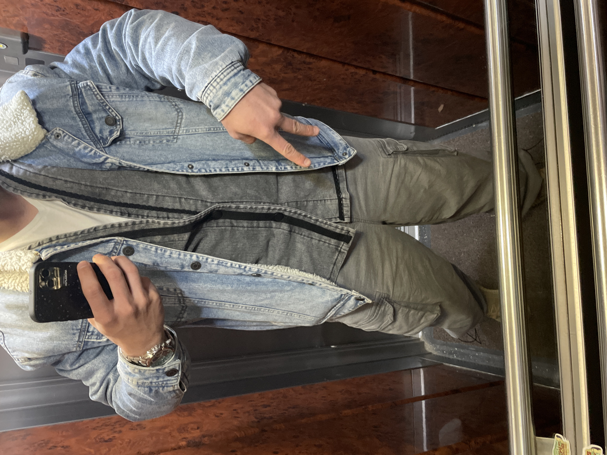 A person stands inside an elevator with wood-paneled walls and silver metal doors. The person is wearing a light blue denim jacket with a fleece lining, a gray top, and gray pants. They are holding a black smartphone in their left hand and making a peace sign with their right hand. The location is likely in Sofia, Bulgaria, based on the information provided.
