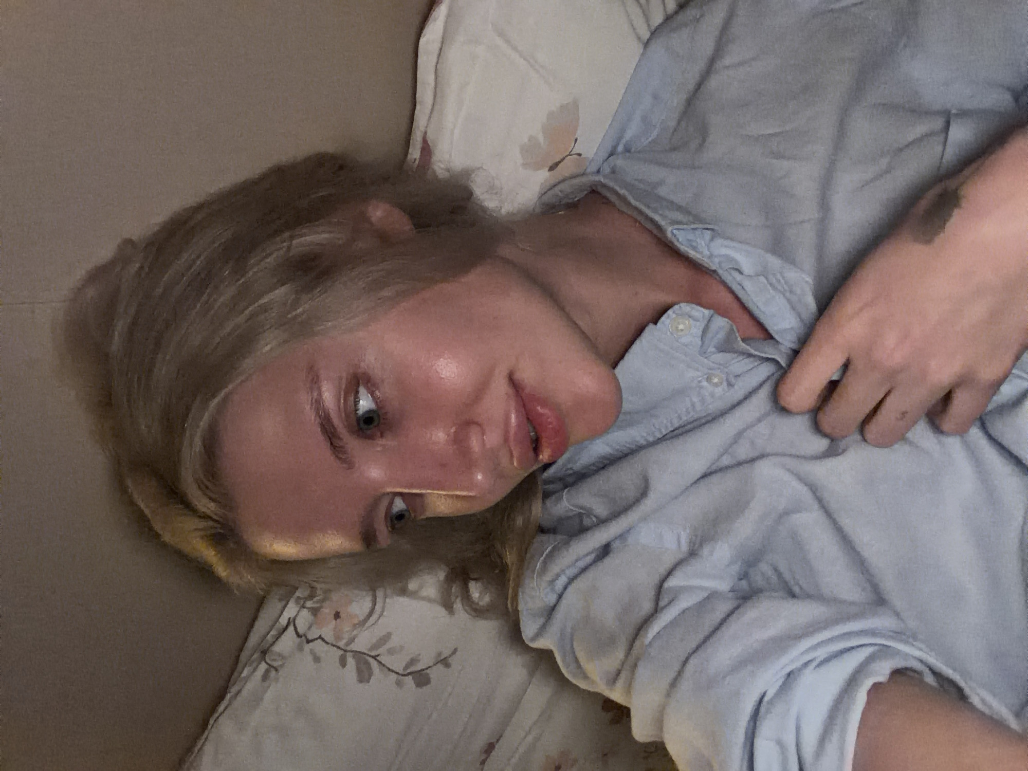A fair-skinned person with blonde hair is lying on a floral-patterned pillow and bed covering. The person is wearing a light blue button-down shirt, partly unbuttoned. Their hand is visible on the shirt. The location is not discernible from the image. There is no indication that the photo was taken in Petrovac na Moru, Montenegro.