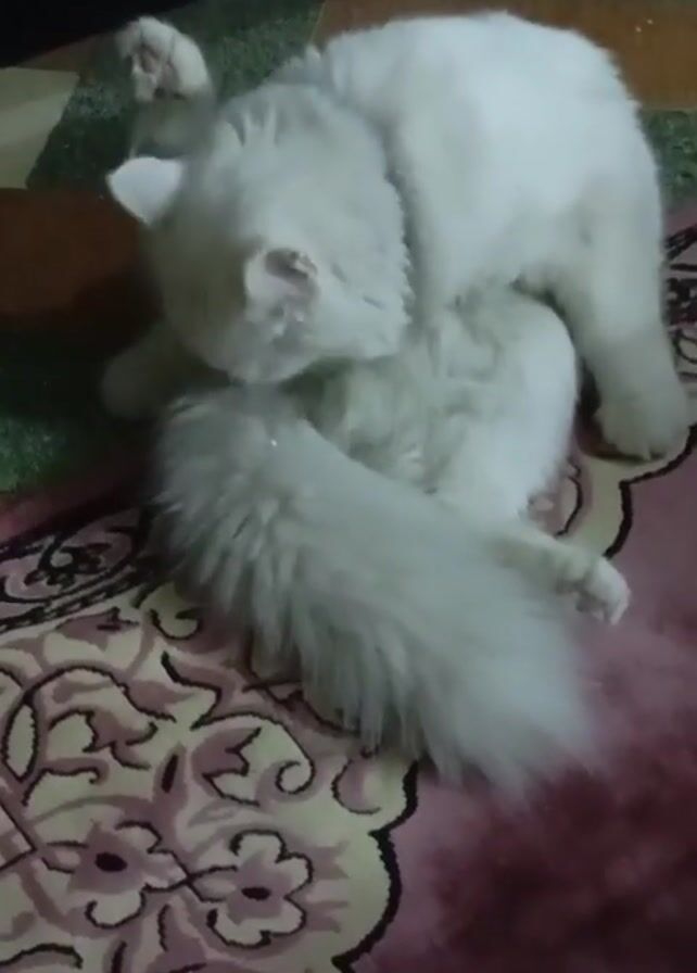 A white, fluffy cat is lying on a floral-patterned rug. The cat is curled in on itself, grooming its tail and back. The rug is patterned with maroon, white, and olive green. The background is dark.