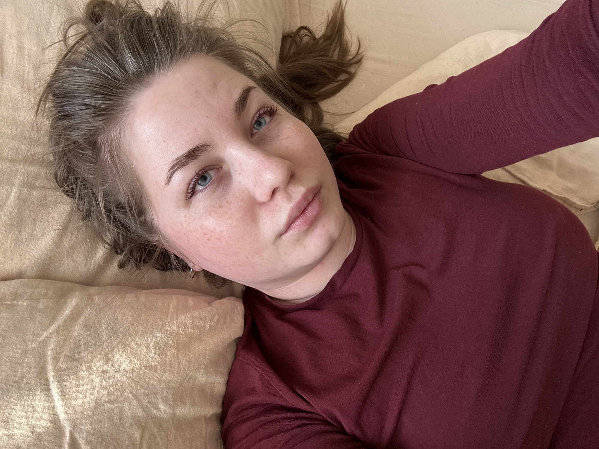 A young adult female is depicted in a close-up, overhead perspective, lying down. She has fair skin, blue eyes, and prominent freckles across her nose and cheeks. Her medium brown hair is disheveled around her head. She is wearing a long-sleeved, maroon-colored top. A small, gold-toned hoop earring is visible in her right ear. Her head rests on a light beige pillow, and she is positioned on a surface covered in matching light beige fabric, consistent with a bed or sofa. The specific location within Chaikovsky, Russia cannot be determined from the visual information presented in the image.