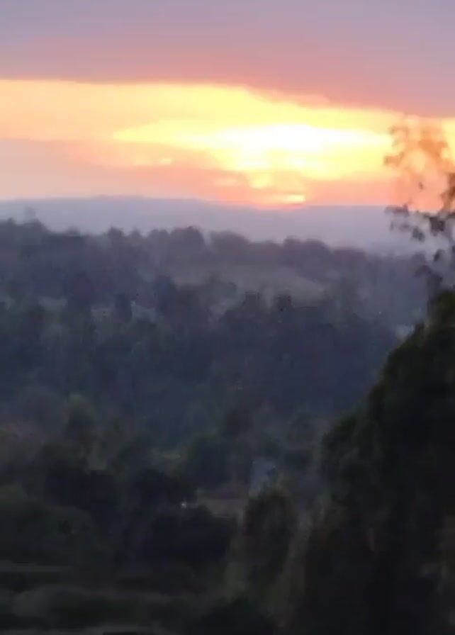 sunset over a forested landscape. The sky is a mix of orange, yellow, and purple hues as the sun dips below the horizon. Layers of dark green trees fill the midground. A glimpse of a rooftop is visible in the foreground. A tree branch partially obscures the view. The atmosphere appears still and quiet.