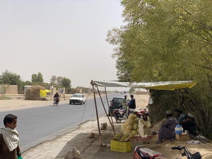 - "The image depicts a daytime scene in Nurod Din, Afghanistan, featuring a paved road alongside a rural roadside market and structures" by FM-B5wmg2, licensed under CC BY 4.0