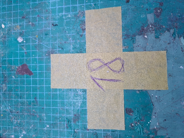 - "An overhead view captures a light-brown, textured, cross-shaped material positioned centrally on a green self-healing cutting mat" by FM-kdrvj1, licensed under CC BY 4.0