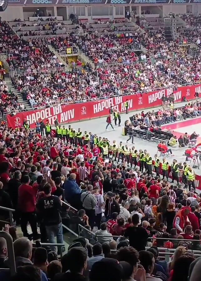 basketball game in a packed arena. A large crowd fills the stands, mostly wearing red. Yellow-vested security personnel line the edge of the court. Players can be seen on the basketball court. Banners with Hebrew writing and the word "Hapoel" are visible. The crowd is energized and likely cheering.