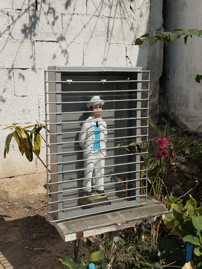 - "The image displays an outdoor scene in Guacara, Venezuela, centered on a male figurine or statue secured within a protective enclosure" by FM-uiwdr1, licensed under CC BY 4.0