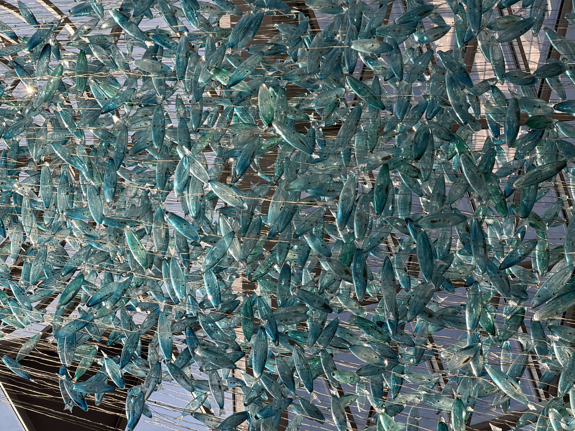 The image captures an overhead view of an art installation in Bakırköy, Turkey. The installation consists of numerous translucent, blue, leaf-shaped objects suspended from thin, horizontal wires. The leaves are clustered together, creating a dense, layered effect. The wires are relatively evenly spaced, running parallel to each other. Glimpses of the building structure, likely a ceiling or support beams, can be seen in the background, along with some natural light. The color of the objects varies in shades of blue and green, suggesting light passing through them.