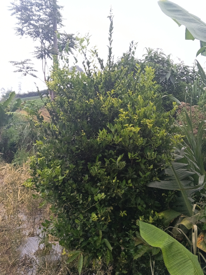 This image depicts a dense outdoor vegetated scene within the rural landscape of Banteay Srei, Cambodia, under an overcast sky. The foreground on the left features a patch of dried, light brown vegetation and ground covered with white plastic agricultural sheeting. Dominating the midground is a robust, multi-stemmed bush or small tree, densely covered with varied green foliage, including lighter green leaves indicating new growth, positioned centrally in the frame. To the right, large, intact green banana leaves are prominently visible, with one extending into the lower right corner, and other broad-leafed plants are partially obscured. In the background, on the left, a tall, slender tree with sparse foliage stands against a bright, hazy or overcast sky, with distant terraced or cultivated hills faintly discernible beneath the horizon line. No people, animals, or direct actions or interactions are visible. The environment suggests an agricultural or semi-cultivated area with a mix of cultivated plants and wild growth.