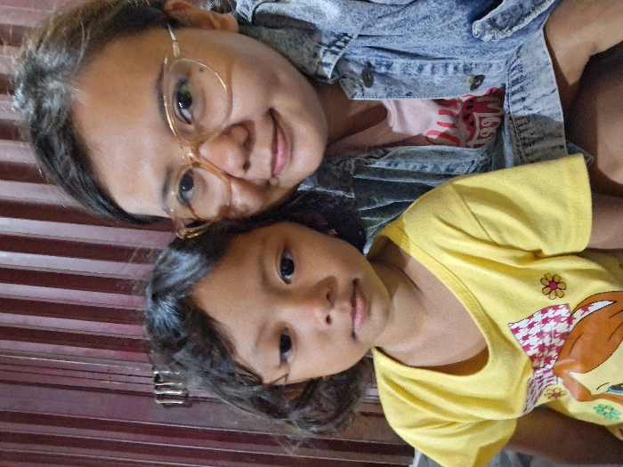 Two females are depicted in a close-up, chest-up portrait format. The subject on the right is an adult female with dark hair, light-framed eyeglasses, a faint smile, wearing a light pink shirt under a light blue denim jacket. Her gaze is directed towards the camera. The subject on the left is a young female child, approximately 5-8 years old, with dark curly hair and a neutral expression, also looking directly at the camera. She wears a short-sleeved yellow t-shirt featuring a multi-colored graphic design including a cartoon character, a red and white checkered bow, and a flower. Both subjects are positioned close together, indicating an interaction. The background consists of vertical reddish-brown or maroon panels, possibly a wooden door or wall, with a metallic latch mechanism partially visible on the left side. The scene is illuminated by what appears to be frontal lighting. The location is in the city of Balonggabus, Indonesia.