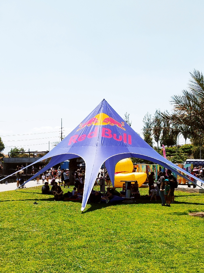 The image depicts an outdoor event on a sunny day in a green park-like area within Quinta Normal, Chile. Dominating the foreground and midground is a large, purple, star-shaped canopy tent bearing the Red Bull logo and wordmark in red and yellow. Numerous individuals are gathered around and under the tent; many are seated or reclining on the green grass beneath its shade, while others stand or mill about. To the right and rear of the Red Bull tent, a large yellow inflatable object, possibly resembling a boat or a stylized character, is visible. Behind it, a structure with colorful, possibly graffiti-style, artwork extends horizontally. In the further background, to the right, vehicles, including what appears to be a brightly colored van, are parked. On the left side of the background, a raised concrete walkway or bridge is visible, with several people standing on it. Utility poles and overhead lines are present in the far left background. Palm trees and other deciduous foliage line the distant background, consistent with the bright, clear sky and strong sunlight casting distinct shadows on the grass. The scene suggests a casual public gathering or festival.