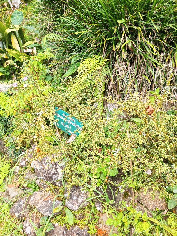 The image displays a dense botanical arrangement, characteristic of a natural or cultivated garden environment in Pachmarhi, India. In the mid-ground, a bushy plant with small, variegated light green and yellowish leaves and delicate white or pale purple flowers is prominent. A rectangular, teal-green plant identification sign is partially obscured within this foliage, displaying the text "Serissa saponica (Thunb.) (Rob.) Japan". Below the bushy plant, a series of moss-covered grey rocks forms a low boundary or terracing, with various smaller green plants and grasses growing between them. The background is composed of lush, layered green foliage, including discernible fern fronds and tall, grass-like plants, with some dried brown plant material present in the upper right quadrant. No people, animals, or discernible actions are depicted.