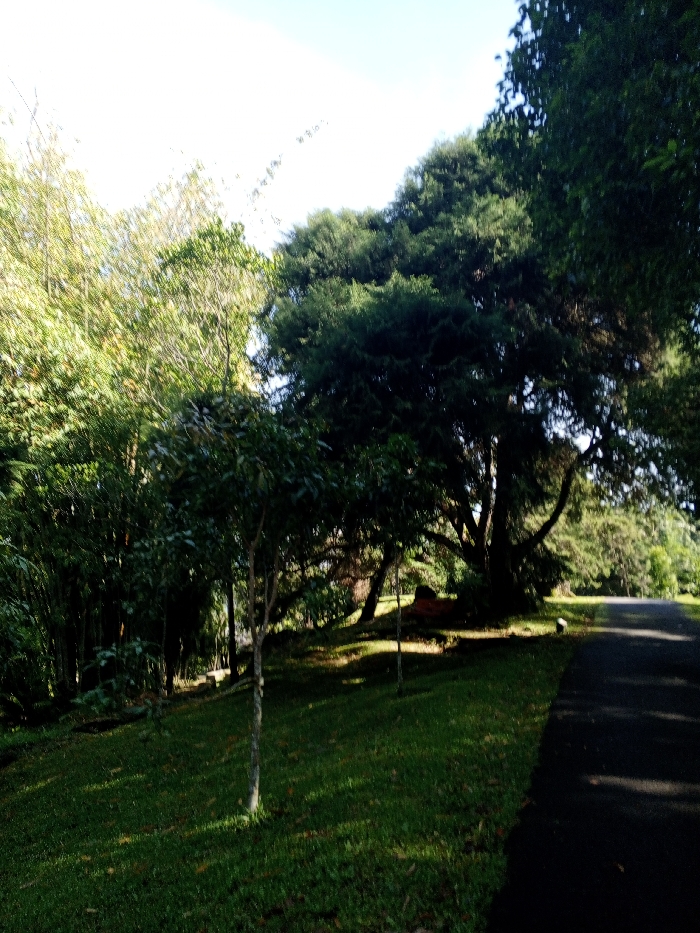 A lush green landscape with a mix of trees and vegetation. Sunlight filters through the foliage, creating patches of light and shadow on the grassy ground. A paved road runs along the right side of the frame. A large tree dominates the center of the scene, its branches reaching out, surrounded by smaller trees.