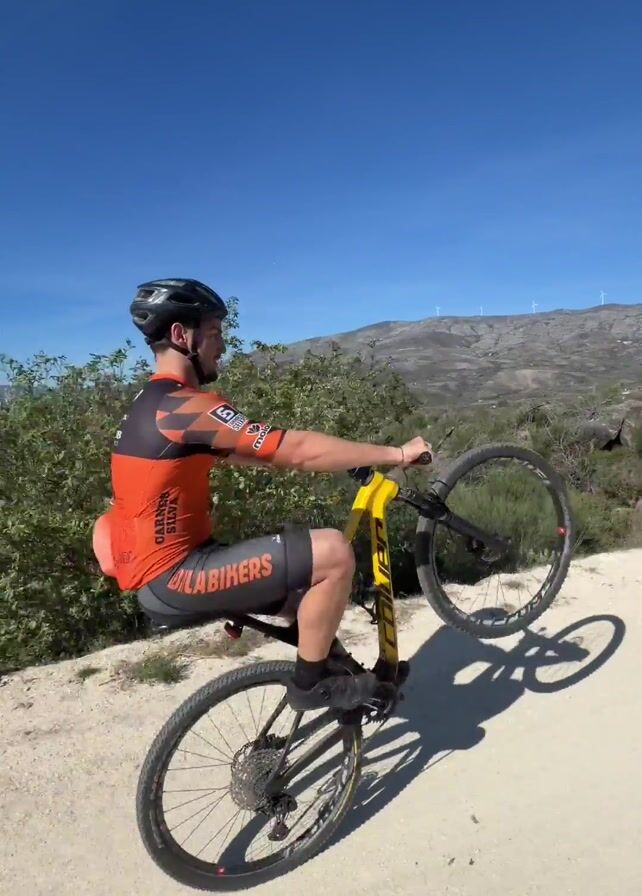 A male mountain biker in an orange and black uniform and helmet performs a wheelie on a yellow and black mountain bike. He is on a dirt path, in an outdoor setting, with a mountainous landscape and windmills in the background. He extends one arm to the side while maintaining the wheelie. The sky is clear and blue.