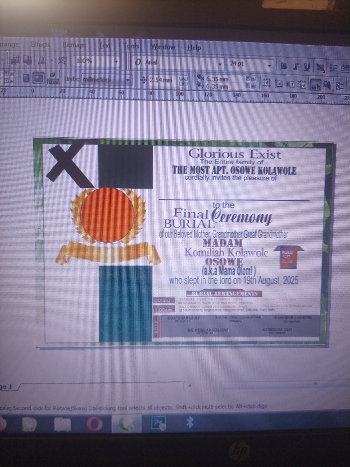 A photograph captures a computer screen displaying a digital design for a funeral invitation. The screen exhibits vertical light and dark lines characteristic of a captured display. At the top of the screen, toolbars for a graphics design software, likely CorelDRAW, are visible, showing options such as "File," "Edit," "View," "Arrange," "Effects," "Bitmaps," "Text," "Tools," "Window," "Help," alongside font selection ("Arial," "24 pt") and unit settings ("millimeters," "100%" zoom). The central subject is a layered funeral invitation on a white background with a green border. The invitation is titled "Glorious Exist" and states, "The Entire family of THE MOST APT. OSOWE KOLAWOLE cordially invites the pleasure of to the Final Ceremony BURIAL of our Beloved Mother, Grandmother, Great Grandmother MADAM Komiliah Kolawole OSOWE (a.k.a Mama Olomi) who slept in the lord on 19th August, 2025." A small red box indicates "AGED 90." Graphical elements on the invitation's left side include a black cross in the upper left, a horizontal black rectangle next to it, an orange vertical-striped circular emblem encircled by a golden wreath, and a teal vertical-striped rectangle below the emblem. The "BURIAL ARRANGEMENTS" section provides specific locations and times: - **TRIBUTE SERVICE**: Saturday, 23rd August, 2025, at 4:00 PM at The Cathedral, St. Saviour’s Anglican Church, Eleguata, Gbongan, Osun State. - **LYING IN STATE**: Friday, 29th August, 2025, at 11:00 AM at the residence, Block 3, 2nd Battalion Army Barracks, Nangnam Road, Idi-Iro, Osogbo, Osun State. - **INTERMENT**: Idi-Iro Cemetery, Osogbo, Osun State. - **RECEPTION**: Osogbo Grammar School, Ayetoro, Osogbo, Osun State. Contact persons listed are Michael Anioluwi (0810 502 6047), Oloweye Olobeter (0803 700 8027), and Akingara Ser (0806 808 6043). The computer's taskbar is partially visible at the bottom, displaying icons for various applications, including one resembling Adobe Photoshop ("Ps") and an HP logo. The photo was taken in a location in the city of Unknown, Unknown.