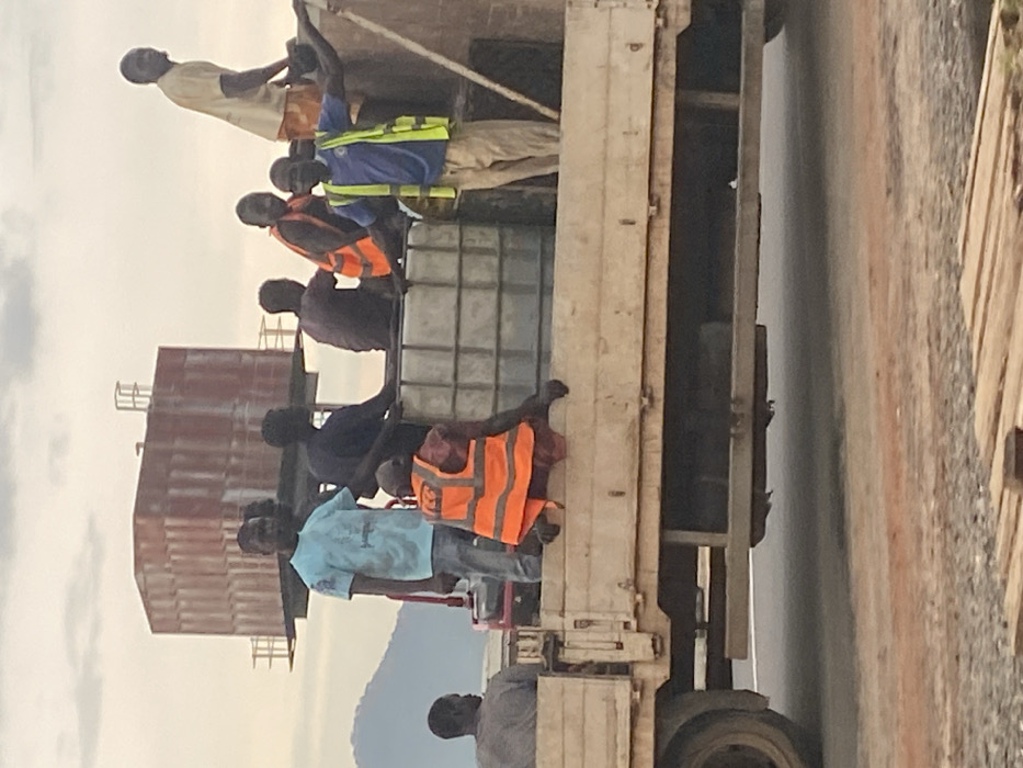This image captures a flatbed truck on what appears to be a paved road in Adankolo, Nigeria. Approximately ten adult males are positioned on and around the truck's bed. The truck is light-colored, possibly white or off-white, with wooden or metal side rails, and its undercarriage is partially visible. On the truck bed, two white Intermediate Bulk Containers (IBCs) are prominently displayed. One man in a light blue t-shirt stands near the front-left of the truck bed, while another in a blue shirt and yellow high-visibility vest stands towards the right with arms slightly outstretched. A third man, clad in an orange high-visibility vest over an orange garment, is seated on the left side rail of the truck, facing away from the camera. Other men, dressed in various casual and work-related attire, including a light yellow t-shirt and orange shorts, are situated within the truck bed or on its periphery. In the background, a large, rectangular, rusted metal structure, consistent with an elevated water tank or reservoir, is visible on a support frame. Distant hills or mountains are present under a pale, overcast sky. The immediate foreground features a reddish-brown ground surface, possibly a dirt shoulder or construction area, with some wooden planks or pallets visible.