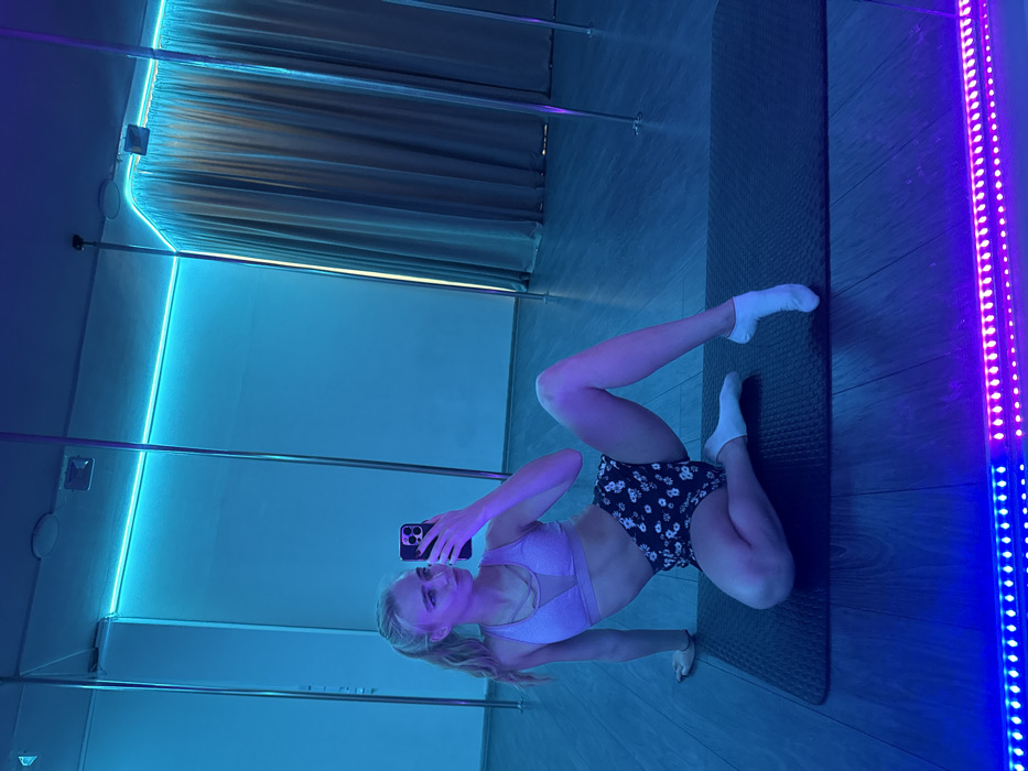 An indoor scene within a pole dance studio in Unknown, Unknown, shows a female with blonde hair tied in a ponytail, seated on a black textured exercise mat