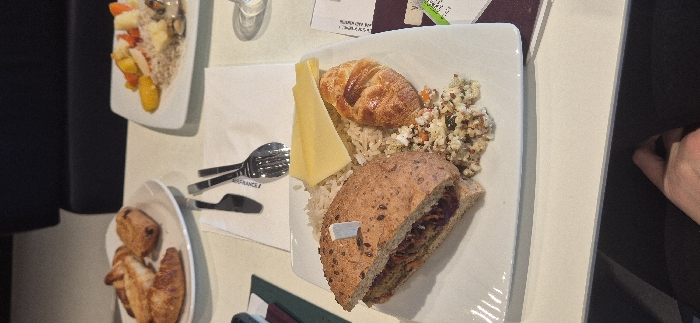 The scene depicts an indoor dining environment, specifically a table setting in a facility located in Le Mesnil-Amelot, France, likely an airport lounge or restaurant given its proximity to Charles de Gaulle Airport and visible "AIR FRANCE" branding on a napkin. In the foreground, a white rectangular plate holds a meal consisting of a halved sandwich on whole-grain bread with seeds, secured by a small white pick. Alongside it are a portion of brown rice, a triangular slice of yellow cheese, a small serving of a mixed grain salad containing visible chopped vegetables, and a golden-brown, braided pastry. A person's fair-skinned hand is partially visible in the lower right corner, resting on the light-colored table surface. To the left, a round white plate contains multiple baked goods, including croissants and a pain au chocolat. To the right of the central plate, a white square plate displays a main course of grains topped with a medley of cooked vegetables (carrots, yellow squash, white pieces) and what appears to be seafood or mushrooms in a creamy sauce. Between the central and right plates, a metal fork and knife rest on a folded white paper napkin, which bears a partial "AIR FRANCE" logo. The table surface is light-colored. In the blurred background, dark-colored upholstered seating, consistent with a lounge or waiting area, is visible. Partially visible to the left of the main plate is a dark green object, possibly a document cover, and to the right, a multi-colored paper item, possibly a boarding pass or menu. A clear drinking glass is also partially visible on the right side of the table.