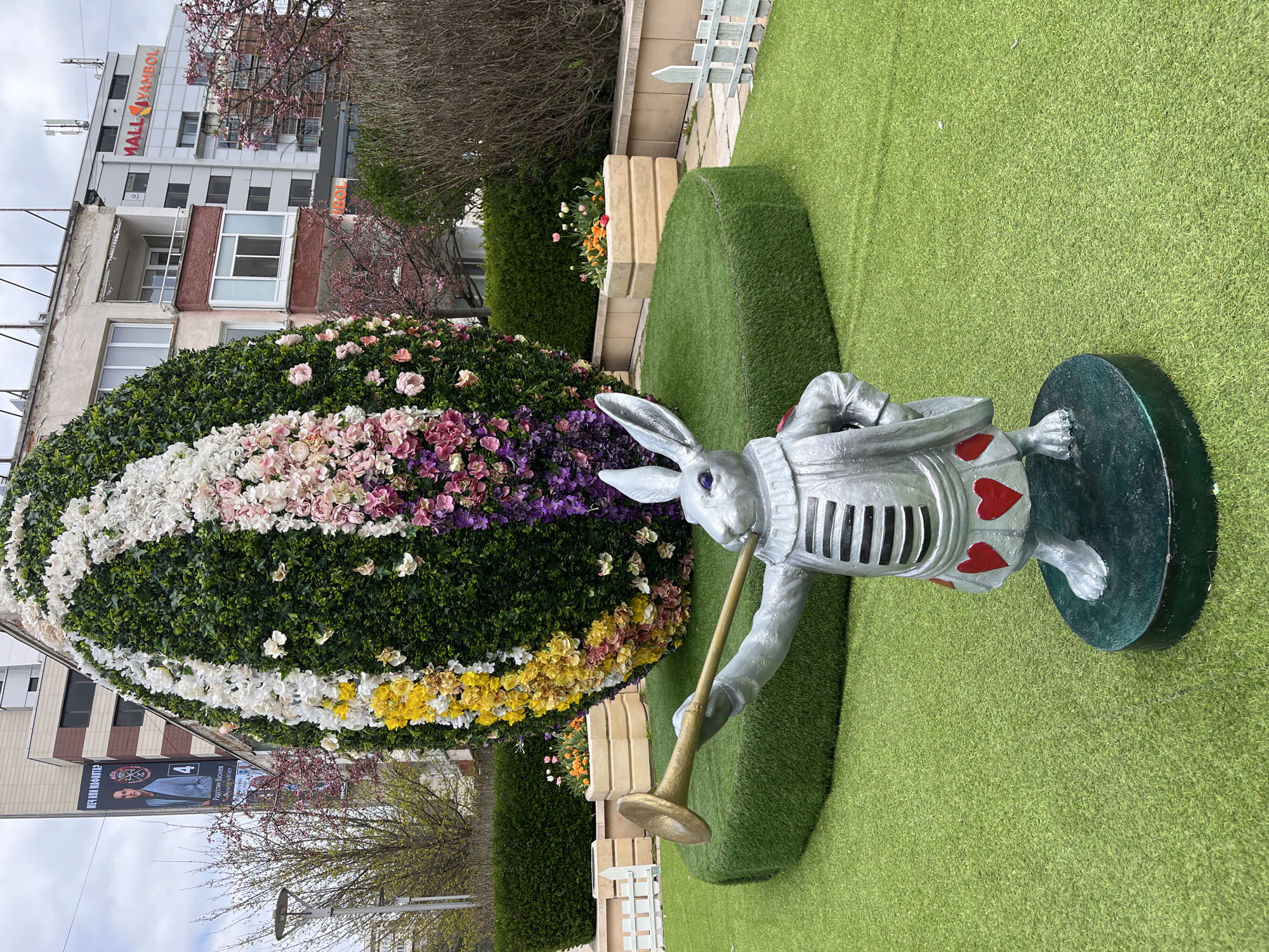A ground-level outdoor shot depicts a decorated Easter display in Yambol, Bulgaria. A large, floral-covered egg dominates the left side of the frame, adorned with white, pink, purple, and yellow flowers. To the right stands a silver-painted statue of the White Rabbit from Alice in Wonderland. The statue is adorned with red hearts on its attire and is positioned on a dark green base, appearing to play a golden trumpet. The display is set on artificial green turf with neatly trimmed green shrubbery behind it. In the background, a multi-story building with the sign "MALL YAMBOL" is visible. A billboard is visible on a building across the street. The sky is overcast.